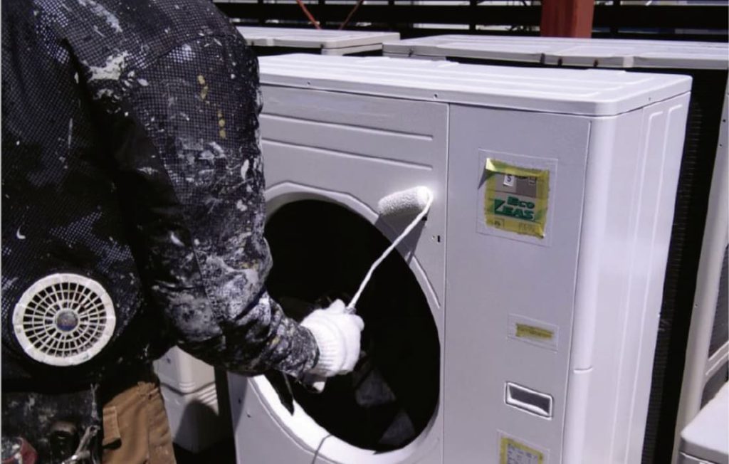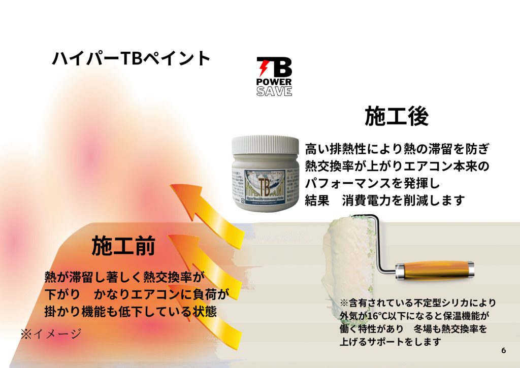 空調室外機に高遮熱、日射反射性能を有する特殊な塗料(白、淡色)を塗装することで、室外機の熱交換率を上昇させ、省エネ効果を発揮します。併せて、電力配給元の配線にTB-節電テープを取り付けることで、より大きな効果を発揮します。