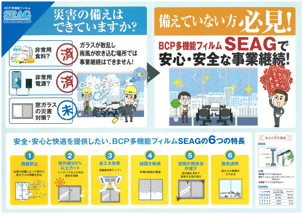 SEAG(シーグ)フィルムは、無色透明タイプの窓ガラス用フィルムで、今ある窓に貼るだけで機能をグレードアップできます。